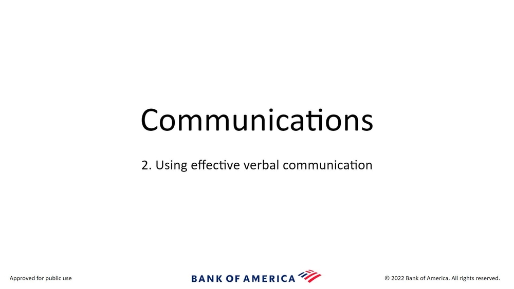 " entryid="1_expd1uvv" infinitecarousel="false" isaudio="false" isaudiogram="false" initialaudiotext="Listen (00:00)" isauthormode="false" isplaylist="false" isvertical="false" partnerid="4699762" playerid="51133253" playlistautocontinue="false" playlistfilter="false" playlisttheme="black" showdisclaimer="false" theme="red" transcripttext="[{"id":"1_expd1uvv","transcript":"%3Cp%3ECommunications.%3C%2Fp%3E%0D%0A%3Cp%3E00%3A01%3C%2Fp%3E%0D%0A%3Cp%3EOverview.%3C%2Fp%3E%0D%0A%3Cp%3E00%3A04%C2%A0%3C%2Fp%3E%0D%0A%3Cp%3EWelcome%20to%20communications%21%3C%2Fp%3E%0D%0A%3Cp%3E00%3A05%3C%2Fp%3E%0D%0A%3Cp%3EBy%20the%20end%20of%20this%20course%2C%20you%20will%20be%20able%20to%3A%3C%2Fp%3E%0D%0A%3Cp%3E00%3A09%C2%A0%3C%2Fp%3E%0D%0A%3Cp%3ERecall%20why%20communication%20is%20important%20as%20you%20grow%20your%20career.%3C%2Fp%3E%0D%0A%3Cp%3E00%3A13%3C%2Fp%3E%0D%0A%3Cp%3EDescribe%20the%20components%20of%20effective%20verbal%20and%20written%20communications.%3C%2Fp%3E%0D%0A%3Cp%3E00%3A17%C2%A0%3C%2Fp%3E%0D%0A%3Cp%3EApply%20active%20listening%20techniques%20to%20balance%20listening%3C%2Fp%3E%0D%0A%3Cp%3E00%3A20%3C%2Fp%3E%0D%0A%3Cp%3Eand%20message%20delivery%20to%20effectively%20connect%20with%20individuals%20and%20teams.%3C%2Fp%3E%0D%0A%3Cp%3E00%3A25%C2%A0%3C%2Fp%3E%0D%0A%3Cp%3EWhenever%20you%20see%20the%20resource%20guide%20icon%2C%3C%2Fp%3E%0D%0A%3Cp%3E00%3A27%3C%2Fp%3E%0D%0A%3Cp%3Eit%20means%20that%20the%20material%20you%20are%20seeing%3C%2Fp%3E%0D%0A%3Cp%3E00%3A29%C2%A0%3C%2Fp%3E%0D%0A%3Cp%3Eis%20also%20in%20your%20resource%20guide.%3C%2Fp%3E%0D%0A%3Cp%3E00%3A32%3C%2Fp%3E%0D%0A%3Cp%3EThe%20guide%20will%20serve%20as%20a%20resource%3C%2Fp%3E%0D%0A%3Cp%3E00%3A33%C2%A0%3C%2Fp%3E%0D%0A%3Cp%3Eand%20is%20ideal%20for%20individuals%20looking%20to%20elevate%20their%20professional%20skills%3C%2Fp%3E%0D%0A%3Cp%3E00%3A37%3C%2Fp%3E%0D%0A%3Cp%3Ein%20order%20to%20grow%20their%20career.%3C%2Fp%3E%0D%0A%3Cp%3E00%3A40%C2%A0%3C%2Fp%3E%0D%0A%3Cp%3EEffective%20communication%20in%20a%20business%20environment%20allows%20us%20to%3A%3C%2Fp%3E%0D%0A%3Cp%3E00%3A44%3C%2Fp%3E%0D%0A%3Cp%3EBuild%20stronger%20interpersonal%20relationships.%3C%2Fp%3E%0D%0A%3Cp%3E00%3A48%C2%A0%3C%2Fp%3E%0D%0A%3Cp%3EInteract%20more%20effectively%20with%20the%20team.%3C%2Fp%3E%0D%0A%3Cp%3E00%3A50%3C%2Fp%3E%0D%0A%3Cp%3EPositively%20affect%20customers%20and%20the%20end%20result.%3C%2Fp%3E%0D%0A%3Cp%3E00%3A54%C2%A0%3C%2Fp%3E%0D%0A%3Cp%3EEnsure%20we%20are%20understood.%3C%2Fp%3E%0D%0A%3Cp%3E00%3A56%3C%2Fp%3E%0D%0A%3Cp%3EAdapt%20to%20a%20virtual%20work%20environment.%3C%2Fp%3E%0D%0A%3Cp%3E00%3A59%C2%A0%3C%2Fp%3E%0D%0A%3Cp%3ECommunication%20in%20a%20workplace%20can%20be%20challenging.%3C%2Fp%3E%0D%0A%3Cp%3E01%3A02%3C%2Fp%3E%0D%0A%3Cp%3EInformation%20is%20fast-paced%2C%3C%2Fp%3E%0D%0A%3Cp%3E01%3A04%C2%A0%3C%2Fp%3E%0D%0A%3Cp%3Etravels%20through%20many%20modalities%2C%3C%2Fp%3E%0D%0A%3Cp%3E01%3A06%3C%2Fp%3E%0D%0A%3Cp%3Eand%20requires%20a%20more%20formal%20communication%20style%3C%2Fp%3E%0D%0A%3Cp%3E01%3A08%C2%A0%3C%2Fp%3E%0D%0A%3Cp%3Ethan%20new%20employees%20may%20be%20used%20to.%3C%2Fp%3E%0D%0A%3Cp%3E01%3A11%3C%2Fp%3E%0D%0A%3Cp%3EThe%20key%20steps%20for%20improving%20communication%20include%2C%3C%2Fp%3E%0D%0A%3Cp%3E01%3A14%C2%A0%3C%2Fp%3E%0D%0A%3Cp%3Eusing%20effective%20verbal%20communication%2C%3C%2Fp%3E%0D%0A%3Cp%3E01%3A16%3C%2Fp%3E%0D%0A%3Cp%3Ewriting%20confidently%2C%3C%2Fp%3E%0D%0A%3Cp%3E01%3A18%C2%A0%3C%2Fp%3E%0D%0A%3Cp%3Eand%20keeping%20a%20balance%20between%20listening%20and%20message%20delivery.%3C%2Fp%3E%0D%0A%3Cp%3E01%3A22%3C%2Fp%3E%0D%0A%3Cp%3EIn%20this%20course%2C%20we%20will%20look%20at%20each%20of%20these%20steps%2C%3C%2Fp%3E%0D%0A%3Cp%3E01%3A25%C2%A0%3C%2Fp%3E%0D%0A%3Cp%3Estarting%20with%20improving%20verbal%20communication.%3C%2Fp%3E%0D%0A%3Cp%3E01%3A27%3C%2Fp%3E%0D%0A%3Cp%3EReturn%20to%20the%20course%20page%20and%20click%20on%20the%20next%20video%20link%3C%2Fp%3E%0D%0A%3Cp%3E01%3A31%C2%A0%3C%2Fp%3E%0D%0A%3Cp%3Eto%20learn%20how%20to%20use%20effective%20verbal%20communication.%3Cbr%20%2F%3E%0D%0A%3Cbr%20%2F%3E%0D%0A%3Cbr%20%2F%3E%0D%0A%3Cbr%20%2F%3E%0D%0A%3Cbr%20%2F%3E%0D%0A%3Cbr%20%2F%3E%0D%0A%C2%A0%3C%2Fp%3E%0D%0A"}]" closetranscripttext="Close Transcript" closedisclaimertext="Close Disclaimer" disclaimertitle="Disclaimer" transcripttitle="Transcript" carouselnextarrowtext="Go to Next Item" carouselpreviousarrowtext="Return to Previous Item" carouseldotslabel="of" data-infoitem-text="Carousel Slide {0} of {1}" playlistitemlabel="Item {0} of {1} Play {2} video" validclosecaptions="true" expandvideowhenplaying="false" posterimageposition="center" data-video-id="1_expd1uvv_" previewvideo="true" playbuttonarialabel="Communications 1. Overview">